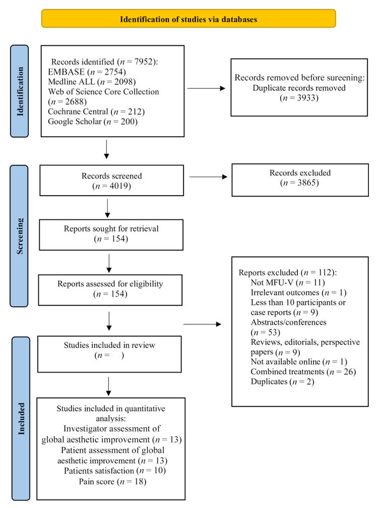 O primeiro achado chocante foi a dificuldade em padronizar os resultados. Alegações estéticas famosas atribuídas ao UMF — como melhora na textura da pele, fechamento de poros, clareamento de pigmentação e elevação de sobrancelha — apresentaram uma heterogeneidade tão grande nos métodos de análise e nos parâmetros de disparo que sequer puderam ser incluídas na conta final da meta-análise. Serviram apenas para discussões narrativas. Ou seja, grande parte dos “milagres estéticos” vendidos hoje não possui garantias científicas sólidas.