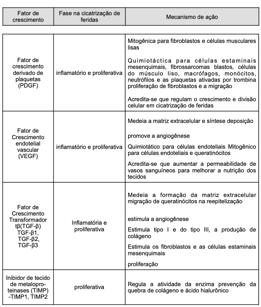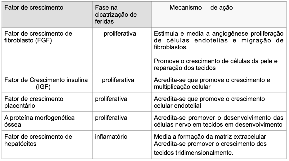 Fabi Sabrina e Sundaram Hema (2014)⁵ explicam em seu artigo a importância de compreender o processo de cicatrização da ferida e a sua ligação com o processo de envelhecimento. Como o conhecimento dos Fatores de Crescimento, tanto injetáveis como tópicos, puderam realizar uma remodelação dérmica, revertendo a colagenase, aumentando a formação de colágeno, estimulando o espessamento epidérmico e diminuindo a inflamação dos tecidos. Compõem um grande grupo de proteínas reguladoras que se ligam aos receptores de superfície celular e servem como mediadores químicos. Por meio dessa interação, eles mediam vias de sinalização celular para controlar o seu crescimento, proliferação e diferenciação. Na pele, eles são sintetizados por fibroblastos, queratinócitos, plaquetas, linfócitos e mastócitos. Os Fatores de Crescimento específicos regulam as atividades celulares vitais, incluindo a mitogênese, angiogênese, quimiotaxia e formação da matriz extracelular (ECM). As tabelas I e II mostram alguns mecanismos de ação que foram identificados para Fatores de Crescimento.