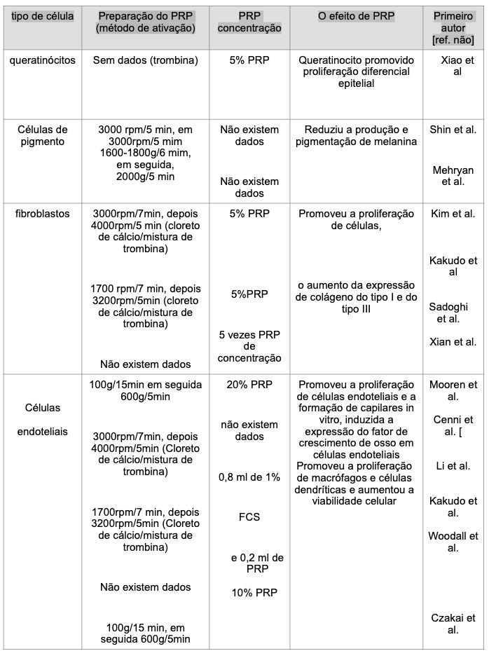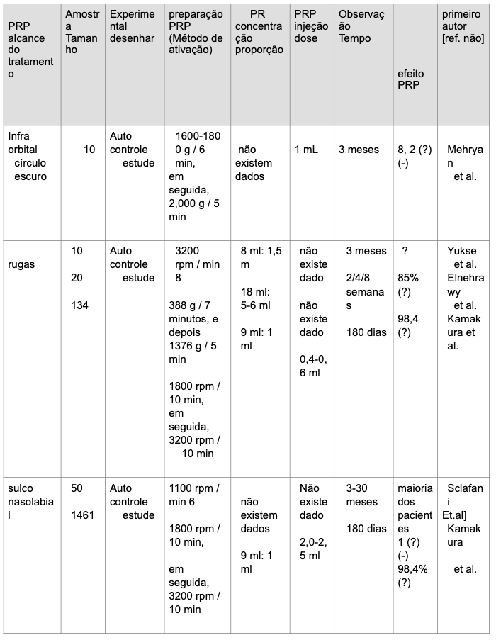 Xiaoxuan Lei, Pengcheng Xu e Biao Cheng (2018)¹⁴ fizeram uma revisão sistemática com 108 artigos sobre o PRP e concluíram que os numerosos fatores de crescimento no PRP podem apresentar efeitos observados em rejuvenescimento facial. O PDGF recruta macrófagos e fibroblastos e estimula os macrófagos a segregarem fatores de crescimento, tais como o TGF-β. Através de tabelas, eles divulgaram as pesquisas de artigos dos autores pesquisados. Na sequência, irei reproduzir as tabelas III e IV.