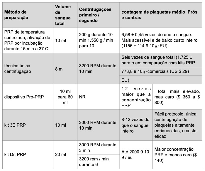 Samadi P., Sheykhhasan M. e Khoshinani H. M. (2018)⁸ fizeram uma tabela, reproduzida logo abaixo (tabela VI), para mostrar diferentes métodos para realizar o PRP.