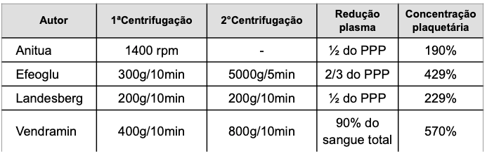 Segundo Vendramin FS, Franco D e Franco TR (2009)¹⁵, três variáveis importantes que influenciam na qualidade do plasma rico em plaquetas são: força de centrifugação, tempo de centrifugação e redução do volume plasmático. Por isso, estudaram-se estas variáveis para definir o método que alcança maiores concentrações de plaquetas, sem prolongar muito o tempo de preparo do produto e conseguindo volumes finais de plasma rico em plaquetas que pudessem ser previstos antes do procedimento. A força de centrifugação, que é um fator importante para a separação dos componentes sanguíneos devido à sua densidade específica, depende da velocidade de centrifugação e do raio da centrífuga e tem como unidade de medida a força da gravidade (g). Por isso, trabalhos que relatam apenas a velocidade de centrifugação, sem mencionar a centrífuga utilizada ou seu raio, fornecem informações incompletas para a reprodução da metodologia. Realizaram 63 testes por meio de centrifugação para saber qual produziria mais plaquetas. A força de centrifugação que mais concentrou plaquetas no seu experimento foi de 400 g na primeira centrifugação e 800 g na segunda, alcançando um aumento em média de 438%. Ao aumentarmos o tempo da segunda centrifugação de 10 para 15 minutos, houve menor aumento na concentração plaquetária (de 438% para 397%), mas sem significância estatística, levando à conclusão de que os valores são similares. Porém, o tempo de preparo do produto deve ser o menor possível, uma vez que é preparado imediatamente antes da cirurgia, ou até mesmo enquanto a cirurgia se inicia. Por isso, adotaram no protocolo o tempo de 10 minutos em cada centrifugação. A preparação por meio de duas centrifugações, sendo a primeira a 400 g por 10 minutos e a segunda a 800 g por 10 minutos, com redução de 90% do plasma, obtém um plasma rico em plaquetas com aumento, em média, de 570% na concentração plaquetária em relação ao sangue. Comparou seu resultado com outros autores (tabela V).