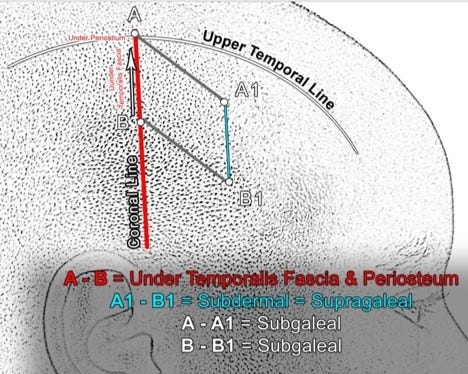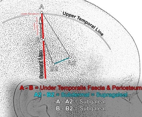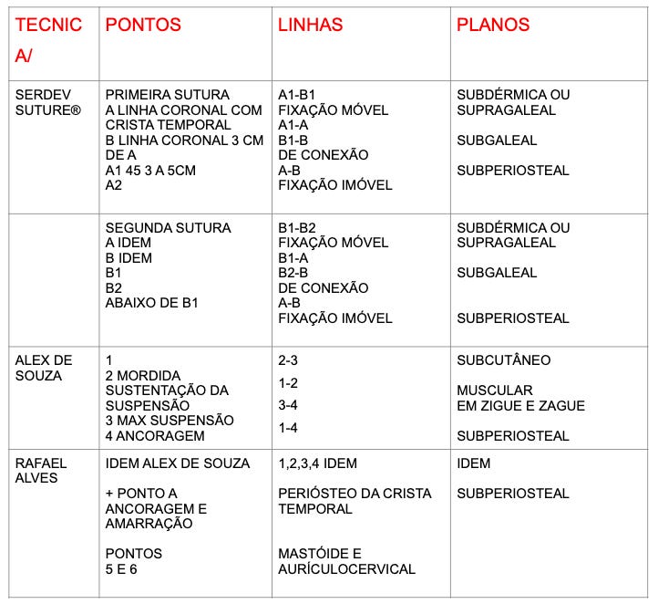 Observações: Considerando as variações de nomenclaturas para nomear as camadas anatômicas e planos de trabalho, neste estudo Subdérmico = supragaleal = subcutâneo; galea aponeurótica = smas = fascia temporal; subgaleal = muscular; Subtemporal= subperiosteal.