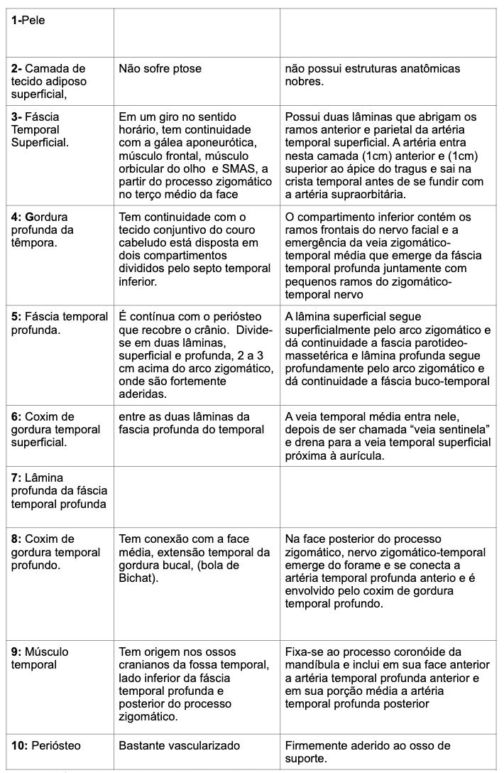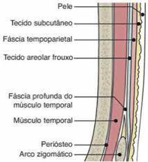 Conforme estudo de Cotofana, Gaete e cols, em cadáveres em 2020, podem ser identificadas 10 camadas paralelas de tecidos moles que compõem a região temporal.