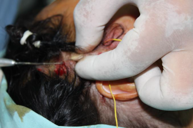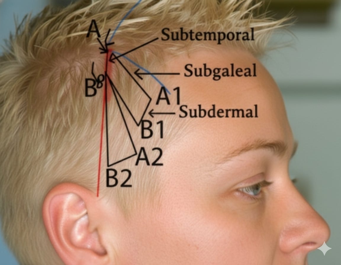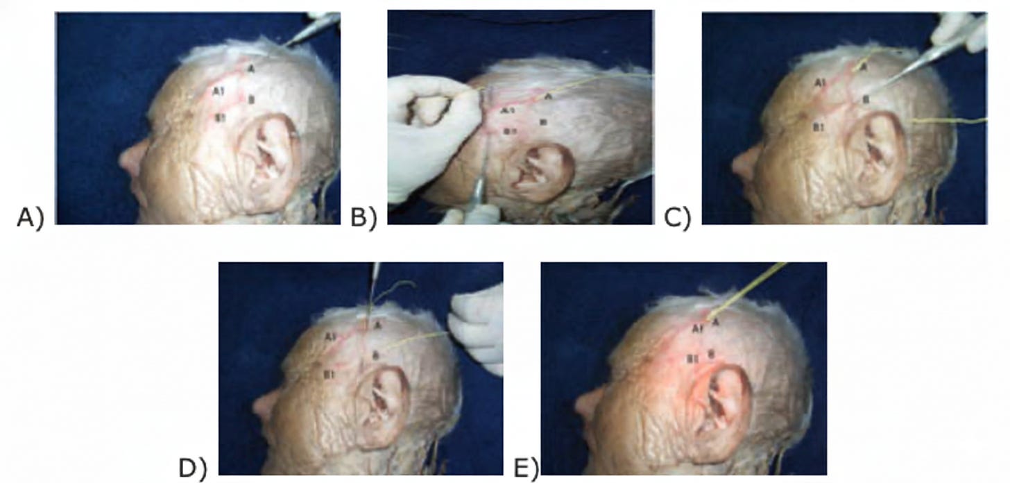 A artéria temporal superficial (ATS) é uma importante continuação da artéria carótida externa e seu ramo frontal pode ser palpada ao longo da linha do cabelo. A veia segue o mesmo padrão. (HOU E COLS., 2020)
