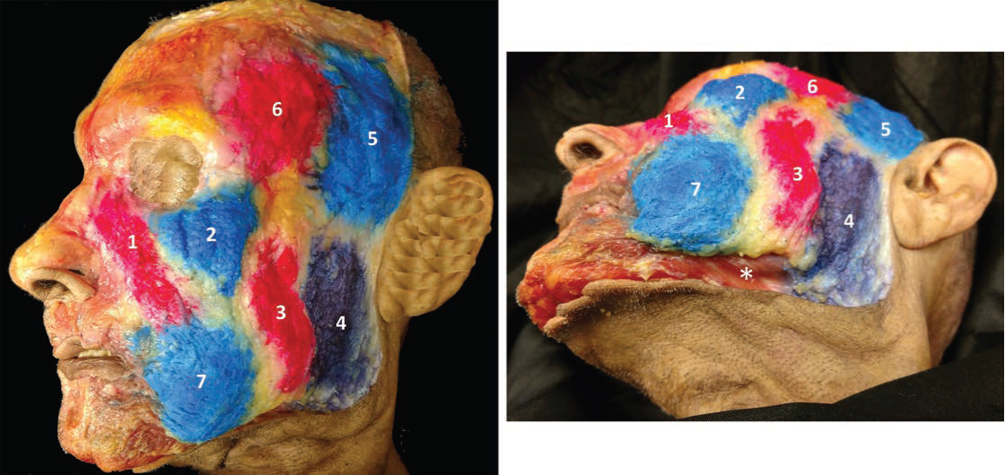 Essa disposição varia entre as regiões faciais, sendo que já chegaram a ser identificadas regiões com 3 (pálpebra inferior) a 10 camadas anatômicas distintas (região temporal). Portanto, a adesão estrita ao princípio das cinco camadas não ocorre em todas as regiões, e embora a gordura facial e a fáscia sejam encontradas principalmente dentro de uma dada camada facial, as estruturas neurovasculares muitas vezes mudam de planos à medida que viajam pela face. Os anexos das camadas e o volume em cada camada, variam à medida o indivíduo envelhece. (SYKES, DILGER E COTOFANA, 2020).