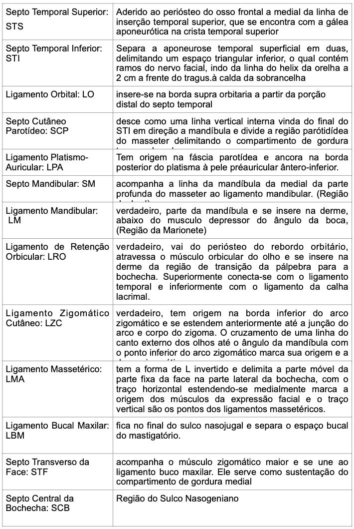 “A recente popularidade em procedimentos que usam fios ou injetáveis exigiu não apenas uma compreensão precisa da nomenclatura dos ligamentos retentores faciais, mas também de sua localização e extensão”, dados que se encontram com grande variabilidade na literatura. (SEO E COLS., 2017).