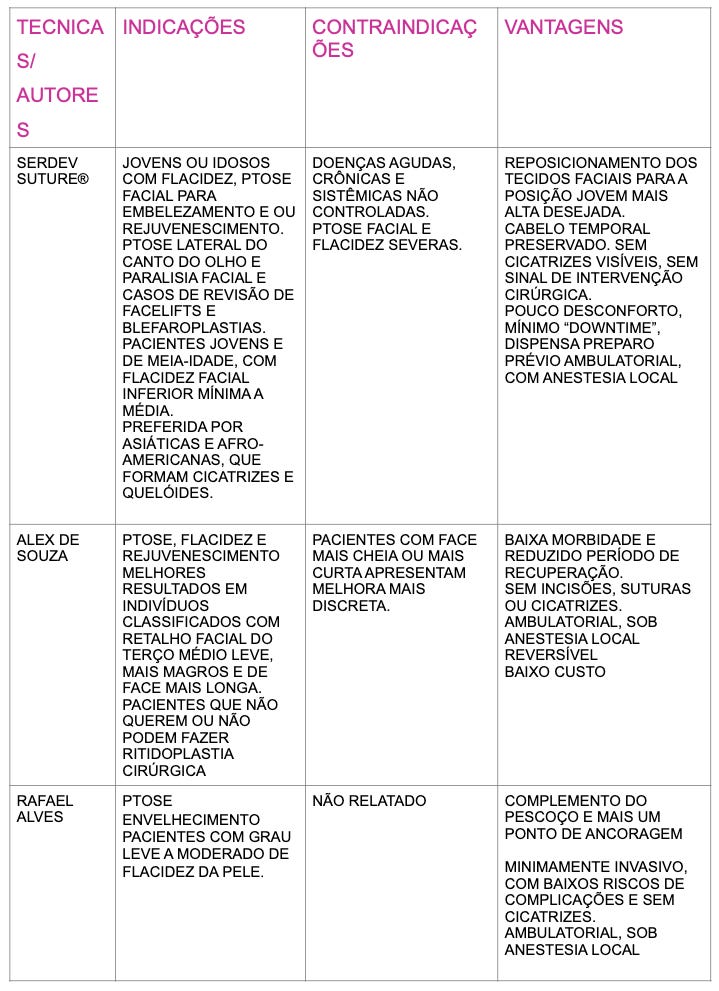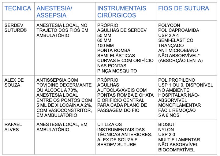 Observou que muitos pacientes não desejam se submeter à inserção de materiais que permaneçam permanentemente no tecido facial e outras técnicas foram sendo modificadas, passando a utilizar fios de materiais absorvíveis. (VILLA E COLS, 2008).