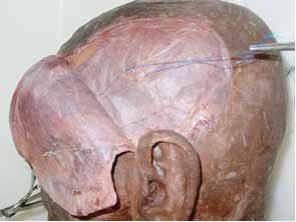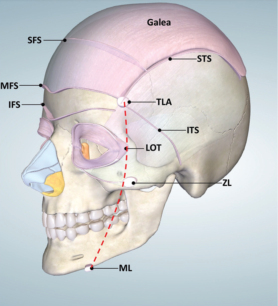 A Fáscia Temporal Superficial é uma camada de aponeurose brilhante e espessa que cobre o músculo temporal. A partir da borda orbital superior, a fáscia temporal divide-se em duas: camada superficial e profunda da fáscia temporal, que envolvem o coxim adiposo intermediário. O ligamento orbitário é uma faixa de tecido conjuntivo que fixa a fáscia temporal ao osso, extremidade caudal da zona de ancoragem e canto lateral-superior da órbita. Diferenças de nomenclatura podem causar confusão no entendimento da diferença entre a fáscia temporal superficial móvel (gálea aponeurótica) que deve ser levantada e a camada superficial imóvel da fáscia temporal que é perigosa de perfurar, devido ao feixe neurovascular subjacente. (SERDEV,2014)