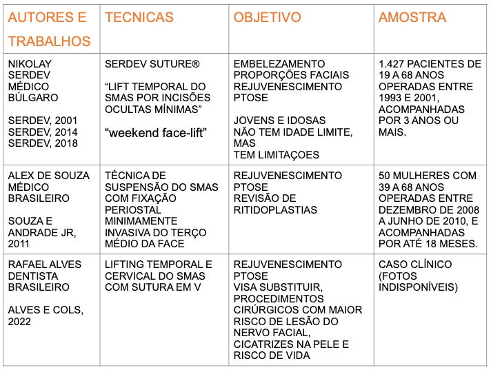 Assim, O “Lift Temporal Do Smas Com Incisões Ocultas Mínimas”, também conhecido como o “weekend face-lift“, ou lifting de fim de semana, introduzido por Serdev na década de 1990 foi revisitado e outras técnicas usando fios não-absorvíveis surgiram (SERDEV, 2014).