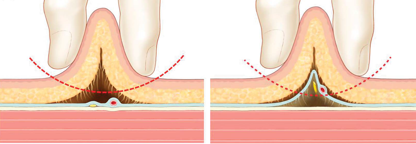 À medida que os ligamentos dividem o plano abaixo do SMAS em compartimentos faciais profundos, a cútis retinacular divide com seus septos fibrosos o plano acima do SMAS, que é a camada subcutânea, em compartimentos de gordura superficiais.
