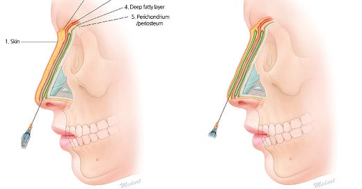 A rinoplastia é um dos procedimentos estéticos mais comuns realizados por cirurgiões plásticos em todo o mundo. Nos últimos tempos, uma rinoplastia não cirúrgica tornou-se a opção preferida para a maioria dos pacientes e médicos. O método não cirúrgico mais comum para correção de volume é o preenchimento. As propriedades de preenchimento permitem que o profissional obtenha resultados ótimos dentro de um menor tempo e com boa longevidade. No passado, os preenchedores eram usados para tratamentos superficiais com abordagem dermatológica e resultados temporários. Atualmente, os preenchimentos não são mais usados para resolver rugas, mas principalmente para restaurar volumes. De fato, os preenchedores são injetados nos planos profundos e não na pele; a estratégia de injeção é baseada em conceitos cirúrgicos e visa a manutenção dos resultados. O tecido mole do nariz consiste em cinco camadas: pele, camada adiposa superficial, camada fibromuscular, camada adiposa profunda e periósteo / pericôndrio.