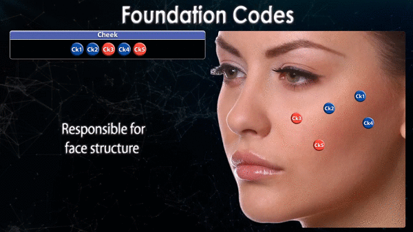 A técnica MD Codes ™ divide o rosto em 13 áreas. Cada código é representado com uma combinação de letras e números.