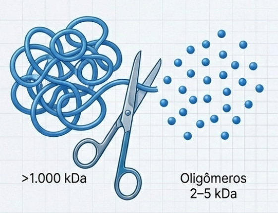 Através de processos como hidrólise controlada ou micronização física é possivel fragmentar o Ácido Hialurônico e transformar os polímeros (macromoléculas de cadeia longa com milhares de unidades repetitivas) em oligômeros (fragmentos curtos com poucas unidades repetitivas) de baixíssimo peso molecular. Estamos falando de uma redução de escala muito grande: