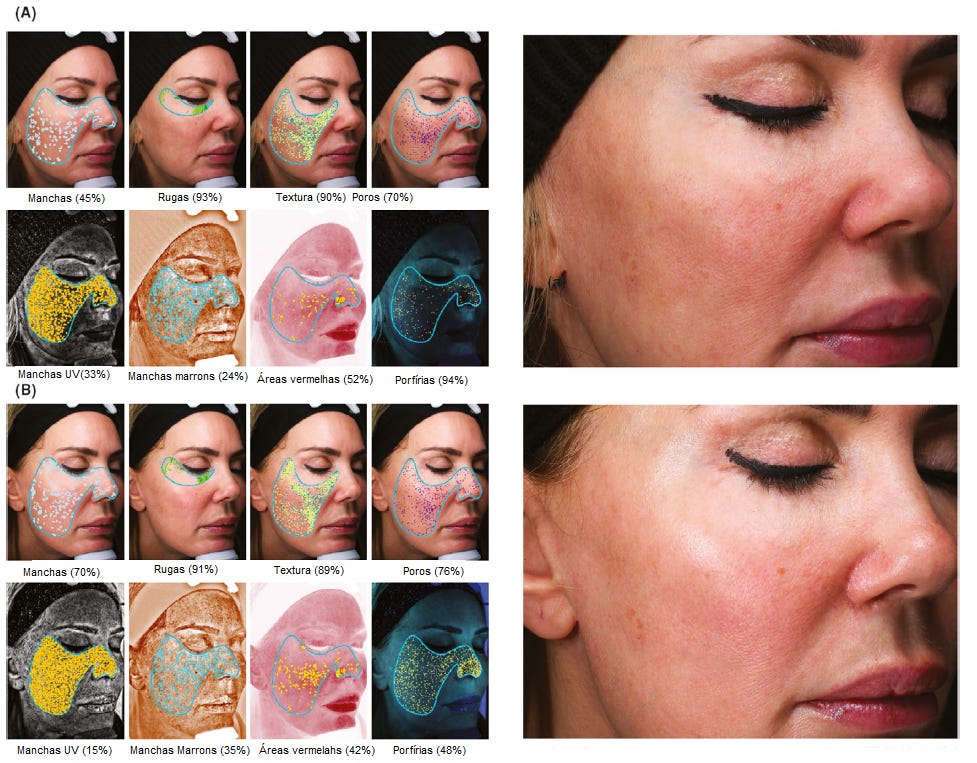 Hassan, Quinlan e Ghanem (2020) afirmam que preparações autólogas derivadas de plaquetas têm sido utilizadas em muitos campos cirúrgicos para melhorar os resultados de cicatrização, com benefícios relatados em várias indicações estéticas. Os autores elaboraram um estudo unicêntrico, prospectivo e não controlado para avaliar a eficácia da fibrina rica em plaquetas injetável (i-PRF) para o rejuvenescimento da pele facial, usando um sistema de análise de pele objetivo e medidas validadas de resultados relatados pelo paciente. Foi utilizada a tecnologia do sistema PRF® PROCESS para preparar a i-PRP. Onze indivíduos saudáveis do sexo feminino foram incluídos no estudo e durante 3 meses receberam injeções intradérmicas mensais de i-PRF em 3 regiões faciais: áreas malar (1 mL de cada lado), prega nasolabial (0,5 mL de cada lado) e pele do lábio superior acima a borda do vermelhão (1 mL). A eficácia dos procedimentos foi avaliada por uma análise objetiva da pele (VISIA®) e uma avaliação subjetiva do resultado relatado pelo paciente (FACE-Q) no início e após 3 meses. Os resultados mostraram uma melhora significativa nas manchas da superfície da pele (P = 0,01) e poros (P = 0,03) no acompanhamento de 3 meses. Outras variáveis, como textura da pele, rugas, manchas ultravioleta e porfirinas, apresentaram melhora numérica. As escalas FACE-Q, que medem a satisfação com a aparência, mostraram uma melhora significativa desde o início, incluindo satisfação com a pele (P = 0,002), satisfação com a aparência facial (P = 0,025), satisfação com as bochechas (P = 0,001), satisfação com face inferior e linha da mandíbula (P = 0,002) e satisfação com os lábios (P = 0,04). Nenhum efeito adverso importante foi relatado. Os autores concluíram que uma série de três injeções de i-PRF resultou em rejuvenescimento significativo da pele da face no acompanhamento de 3 meses, conforme demonstrado por parâmetros de análise de pele aprimorados e escores de autoavaliação do paciente.