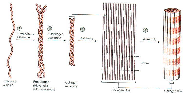 O pró-colágeno completo, obtido de células dermatoespáticas não forma fibras facilmente. O pró-peptídeo intacto parece, portanto, inibir a fibrilação.