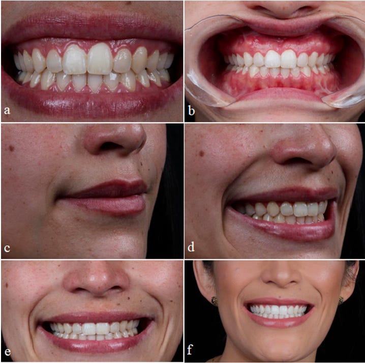 Como uma abordagem multidisciplinar é muitas vezes necessária para alcançar a estética harmonia entre rosto, dentes, lábios e gengivas, interação com diversos especialidades da Odontologia devem ser utilizadas para solucionar a complexidade de cada caso do paciente [13]. Considerando que um sorriso harmonioso é influenciado por vários fatores como exposição gengival mínima, presença de tecido gengival nos espaços interproximais, simetria entre o margem gengival e lábio superior, harmonia entre anterior e posterior segmentos, e proporções e anatomia corretas [14], este caso também envolveu uma etapa de reparo gengival e clareamento dental, passos importantes na busca de um excelente resultado.