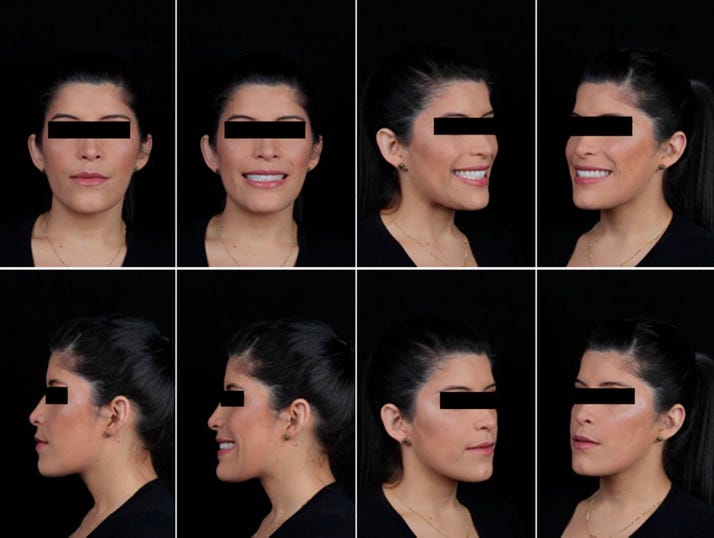 As melhorias cosméticas minimamente invasivas têm sido cada vez mais procurou remodelar as proporções faciais e aumentar a simetria [3]. Dentro na busca de resultados estéticos ideais, conhecimento da anatomia facial, e o tratamento deve ser focado nas necessidades do paciente para que uma abordagem estética específica para que cada caso seja selecionado corretamente [11]. O planejamento e a execução do tratamento no presente caso envolveu uma etapa de harmonização dente-lábio com a aplicação de AH para melhorar os resultados estéticos do paciente. Basicamente, esse material é injetado por via subcutânea para dar volume, alterar a conformação da superfície, engrossar a pele ou tecidos ou preencher um rítmico. Todos esses pontos são uma forma de escultura, que resulta em uma mudança significativa na aparência facial [4].