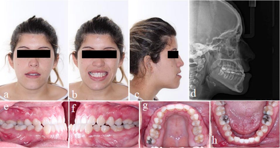 Paciente do sexo feminino, 28 anos, branca, com boa saúde, sem história de uso de drogas ou qualquer informação familiar relevante ou doença genética, procurado assistência da equipe de Odontologia do Hospital São Vicente de Paulo, em Passo Fundo, Rio Grande do Sul, Brasil, para reabilitação orofacial, queixando-se de prognatismo mandibular, anteroposterior deficiência, apinhamento dentário, má oclusão e problemas funcionais e estéticos. alterações (Classe III de Ângulo). O paciente relatou estar incomodado com a falta de harmonia em sua face e os problemas oclusais e funcionais desenvolvido ao longo do tempo devido à discrepância esquelética que afetou suas interações psicossociais.