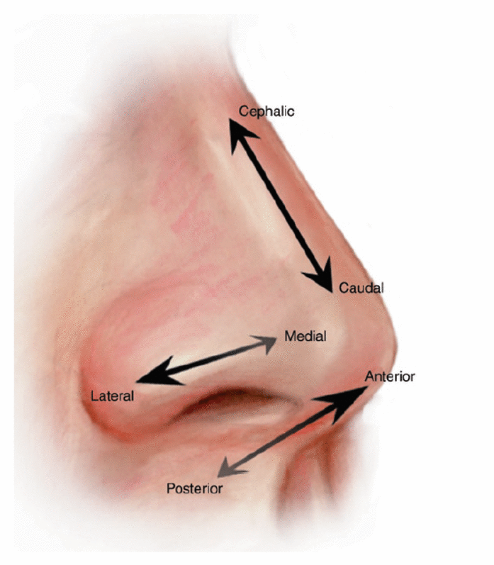 O ângulo nasomental geralmente mede entre 120 ° e 132 °. O ângulo nasolabial é o ângulo entre a columela e o lábio superior; idealmente, mede entre 105 ° e 115 ° em mulheres e 90 ° e 105 ° em homens. As proporções estéticas da forma e do tamanho nasal ideal foram estabelecidas. Na vista lateral, a distância da borda vermelha do lábio superior ao subnasal é igual à distância do subnasal ao pronasalae. [1] A distância do sulco alar facial ao ponto médio das narinas é idealmente igual à do ponto médio até a borda caudal da ponta nasal. Na vista lateral, um triângulo retângulo com as proporções dos lados sendo 3: 4: 5 e os vértices no násio, sulco alar-facial e ponta foi descrito para ilustrar as proporções e tamanhos nasais ideais. [2] A Figura 2.1 ilustra a nomenclatura direcional padrão.