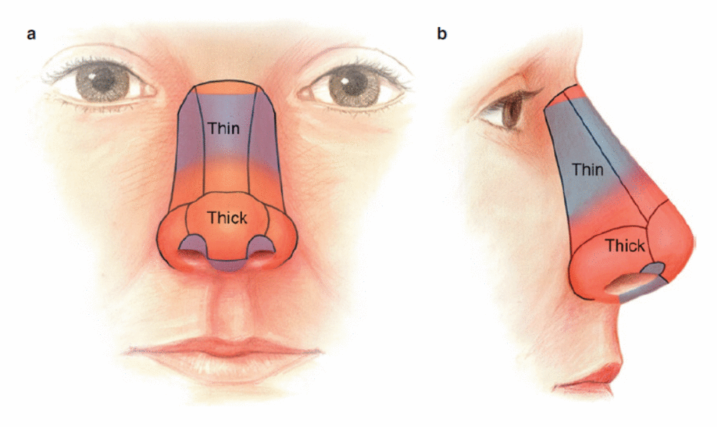 A espessura da pele varia amplamente entre os indivíduos e entre as unidades estéticas de qualquer indivíduo (ver Fig. 2.2). Lessard e Daniel analisaram 60 dissecções de cadáveres e 25 pacientes submetidos à septorrinoplastia e encontraram a espessura média da pele maior no radix (1,25 mm) e menor no rinião (0,6 mm) . [4] A pele é mais fina e mais móvel sobre o dorso; ao passo que é mais espesso e mais aderente à estrutura nasal subjacente na ponta nasal e asa (ver Fig. 2.2). Na porção cefálica das paredes laterais do nariz, a pele é fina; no entanto, caudalmente, ele se torna mais espesso nas proximidades do sulco alar. Apesar de ser mais espessa na ponta nasal, a pele rapidamente passa a ser muito fina, onde cobre as margens das narinas e a columela. A grande aproximação da derme do revestimento da pele e cobrindo as facetas nasais e as margens das narinas torna essas áreas especialmente vulneráveis a incisivos e irregularidades de contorno após a reconstrução.