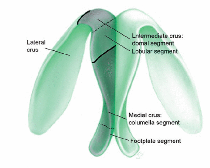 A cartilagem alar é subdividida em crura medial, intermediária e lateral (Figs. 2.7 e 2.8). A cruz medial consiste na platina e nos segmentos columelares. A platina é mais posterior e representa a porção alargada da base columelar. O segmento columelar começa no limite superior da platina e se junta à crura intermediária no ponto de quebra columelar. O ponto de interrupção representa a junção da ponta e da columela. A aparência e a projeção da columela são influenciadas pela configuração das cruras mediais e do septo caudal. Os tecidos moles intervenientes entre os segmentos columelares das cruras mediais podem preencher este espaço; entretanto, em pacientes com pele fina, a columela pode ter uma aparência bífida. As assimetrias columelares podem ser secundárias a deflexões do septo caudal ou assimetrias intrínsecas das cartilagens alares. No nariz esteticamente agradável, a columela é posicionada 2–4 mm caudal às margens da narina, e a forma da base nasal se assemelha a um triângulo equilátero. Narinas atraentes têm formato de lágrima, na opinião de muitos.