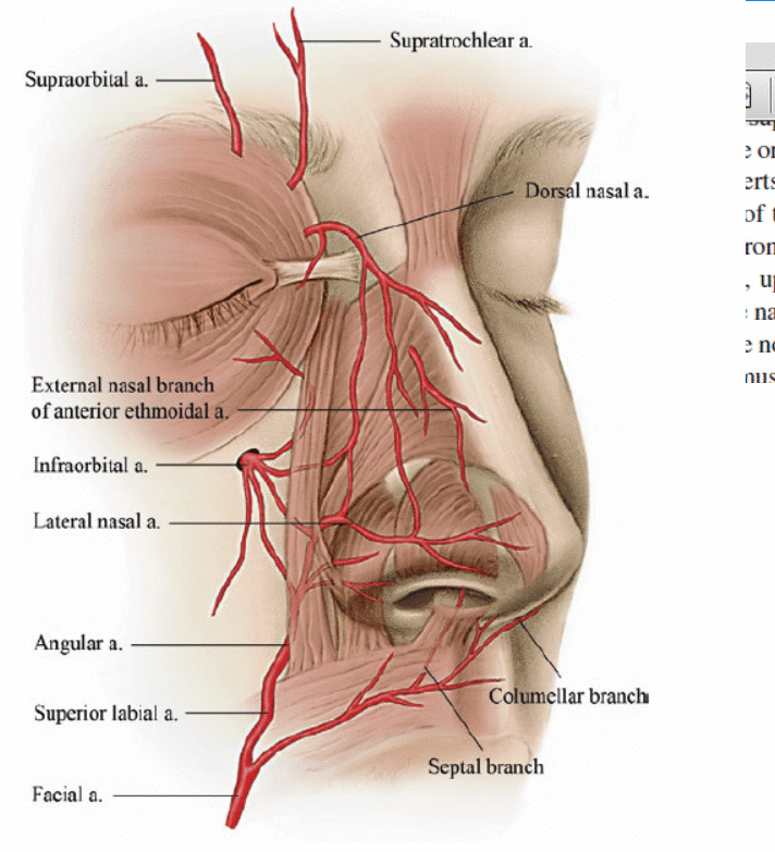 O peitoril da narina e a base columelar são supridos por ramos da artéria labial superior. Um ramo da artéria labial superior, a artéria columelar, sobe superficialmente à crura medial e é seccionado por uma incisão transcolumelar durante uma abordagem de rinoplastia externa.
