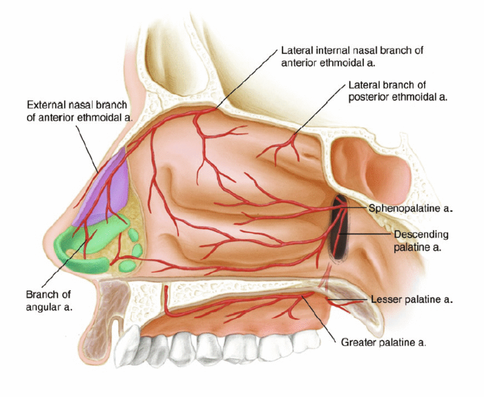 A ponta nasal é suprida pelo ramo nasal externo da artéria etmoidal anterior, bem como pela artéria columelar. A artéria etmoidal anterior, um ramo da artéria oftálmica, perfura o osso na parede medial da órbita no ponto onde a lâmina papirácea do osso etmoidal se articula com a porção orbital do osso frontal (a sutura frontoetmóide). O vaso entra nos seios etmoidais para suprir a mucosa e envia ramos para a face superior da cavidade nasal. O ramo nasal externo da artéria etmoidal anterior emerge entre o osso nasal e a cartilagem lateral superior para suprir a pele que cobre a ponta nasal. O suprimento sanguíneo da ponta nasal também recebe contribuições da artéria nasal lateral, um ramo da artéria angular.