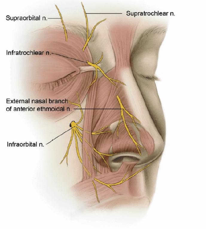O suprimento do nervo sensitivo da pele nasal é feito pelas divisões oftálmica e maxilar do quinto nervo craniano (Fig. 2.5). Ramos dos nervos supratroclear e infratroclear suprem a pele que cobre o radix, o rhinion e a porção cefálica das paredes laterais do nariz. O ramo nasal externo do nervo etmoidal anterior emerge entre o osso nasal e a cartilagem lateral superior para fornecer a pele sobre a metade caudal do nariz. Este nervo é geralmente seccionado pela elevação dos tecidos moles durante a rinoplastia. O nervo infraorbital fornece ramos sensoriais para a pele da face lateral do nariz.