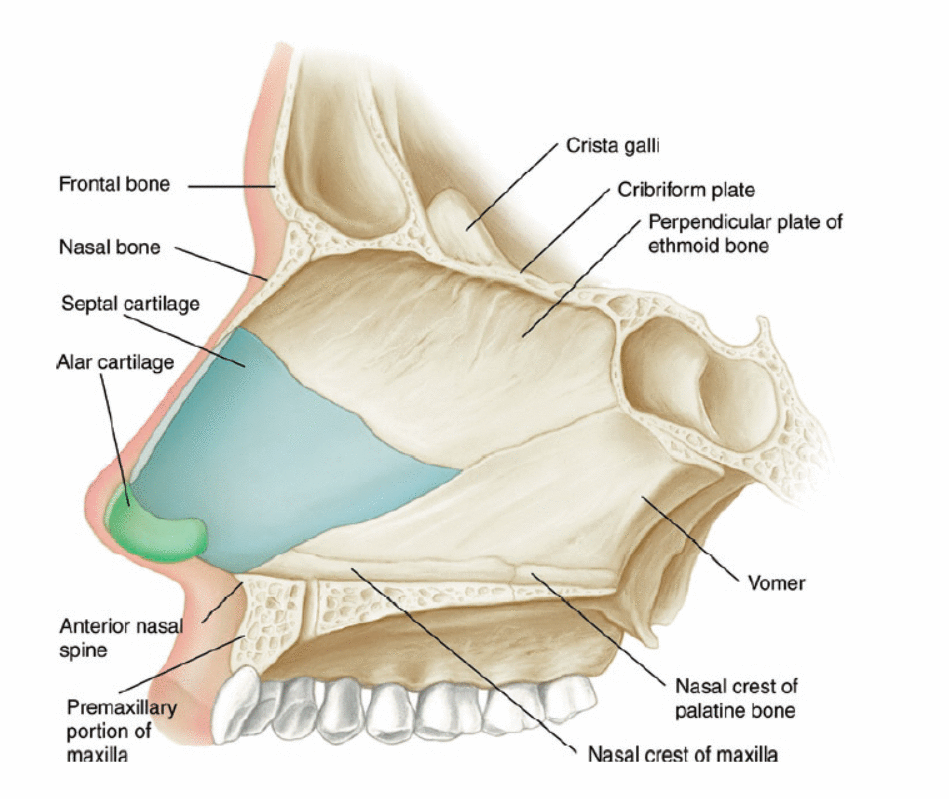 O septo cartilaginoso é coberto em ambos os lados por uma fina mas altamente vascularizada camada de mucopericôndrio. Um plano ideal de dissecção está localizado entre ele e a cartilagem. A cartilagem septal é, entretanto, dependente do revestimento do mucopericôndrio para seu suprimento sanguíneo, e a cartilagem septal sem mucopericôndrio em ambos os lados eventualmente sofrerá necrose. Quando o mucopericôndrio está presente em um lado da cartilagem septal, é provável que a cartilagem sobreviva.