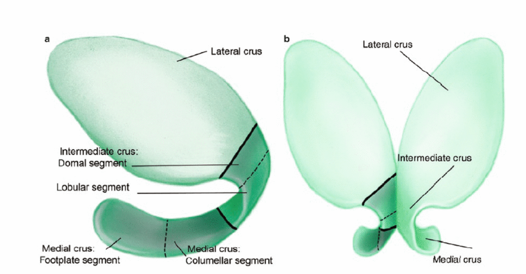 As cruras intermediárias consistem em um segmento lobular e um domal. Na maioria dos narizes, as bordas cefálicas do segmento lobular estão bem próximas e as bordas caudais divergem. [10] As cruras intermediárias são unidas pelo ligamento interdomal, e a falta de tecido mole interveniente pode dar à ponta uma aparência bífida. Em uma vista lateral, a estrutura interna responsável pela proeminência do ponto de definição da ponta, ou pronasalae, é a borda cefálica do segmento domal da cruz intermediária. Assim, a forma, o comprimento e a angulação das cruras intermediárias determinam a configuração do lóbulo infratip e a posição do ponto que define a ponta. O ponto de interrupção supratip é a junção entre a cruz intermediária e a cruz lateral.