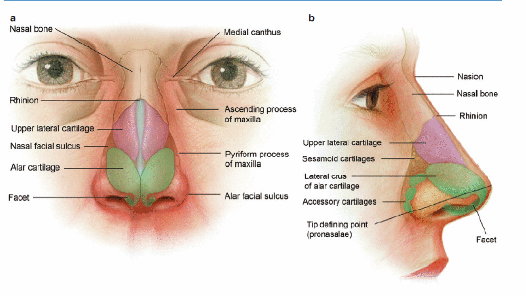 O nariz é uma estrutura piramidal altamente contornada, situada no centro da face. É composto de pele, mucosa, osso, cartilagem e tecido de suporte intermediário, incluindo gordura, músculo e tecido conjuntivo. O nariz esteticamente agradável proporciona uma transição suave e natural dos olhos para os lábios. Um nariz distorcido ou deformado atrai a atenção dos olhos e dos lábios, atrapalhando a harmonia estética do rosto. Funcionalmente, o nariz é a porta de entrada para o sistema respiratório. O nariz aquece, umidifica e filtra o ar, permitindo que as partículas inaladas entrem em contato com o epitélio olfatório. As perturbações da anatomia nasal normal podem prejudicar a função nasal e levar a queixas de obstrução nasal, drenagem nasal e olfato comprometido.