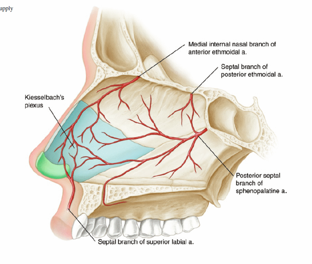 O suprimento sanguíneo para o septo consiste no ramo septal da artéria labial superior, ramos das artérias etmoidais anterior e posterior e o ramo septal posterior da artéria esfenopalatina (Fig. 2.10).