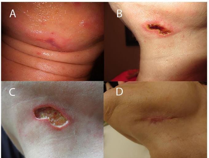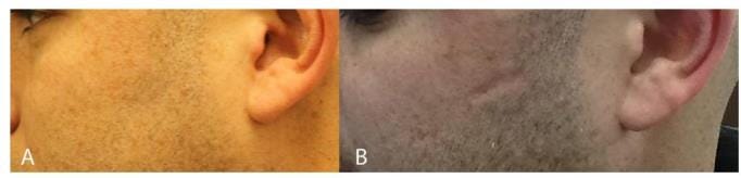 Apesar de pouco comum, estudo mostrou 5 casos de queimaduras após tratamento com MFU que deixaram cicatrizes no rosto (20) (Figura 8 e 9).