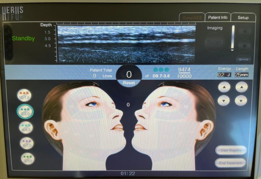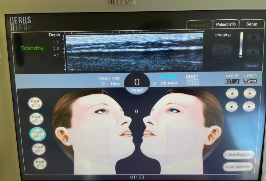 Os aparelhos que têm visualização são mais assertivos na profundidade, visto que cada ser humano tem uma espessura de derme diferente, e dependendo de quanta pressão o médico colocar pode atingir diferentes camadas. A espessura do gel também pode alterar a profundidade do tratamento. Um gel muito espesso pode interferir na penetração do ultrassom e ser a causa de queimadura (5).