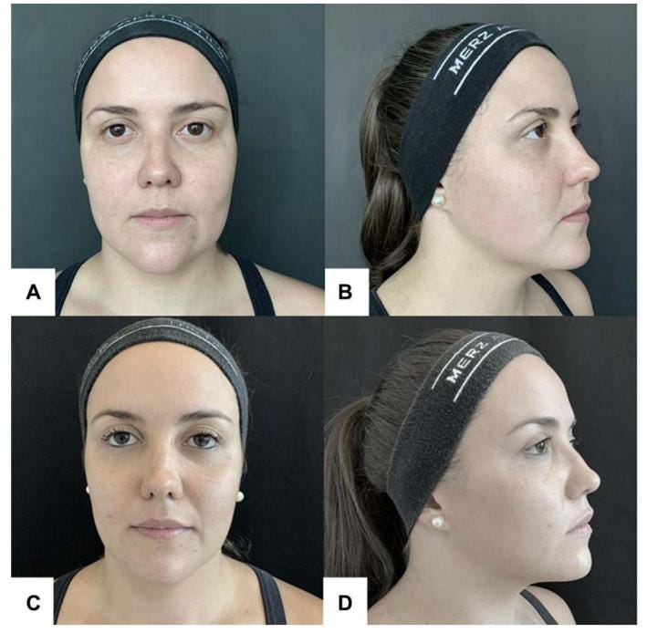 Na avaliação cega das fotografias do dia 1 e 3 meses pós-tratamento, 68,6% dos indivíduos tiveram melhora nas áreas submentoniana e do pescoço, e uma melhora na aparência do rosto e pescoço foi percebida por 67% dos indivíduos tratados (9).