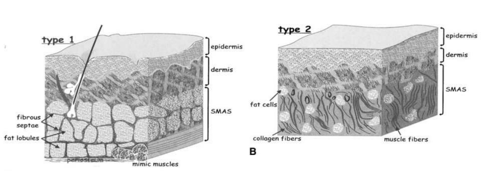 O tipo I ou SMAS fixo, que é o de interesse para o tratamento com ultrassom microfocado. Está localizado na parte posterior do rosto. É uma malha de septos que envolve lóbulos de células de gordura que servem de pequenas almofadas com propriedades viscoelásticas. A interconexão é ancorada no periósteo pelos ligamentos ou nos músculos (17).