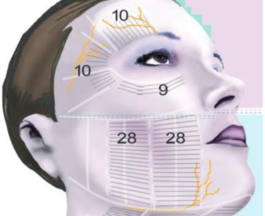 Um risco pouco comum é a lesão transitória do nervo. Os nervos motores da face correm profundamente ao SMAS e os nervos sensoriais são superficiais. Por isso, os nervos motores são menos propensos a serem afetados que os sensitivos. Porém as variações na anatomia podem levar a alguns danos aos nervos motores. As áreas de maior risco de lesão são o ramo temporo-frontal do nervo facial e o nervo mandibular marginal, em locais onde o trajeto desses nervos se torna relativamente superficial. Em um esforço para evitar esses efeitos colaterais relacionados aos nervos, as empresas marcam como “zonas proibidas” em suas diretrizes de tratamento para alertar o profissional de saúde a evitar essas áreas de alto risco (região temporal e região mentoniana) (Figura 7).