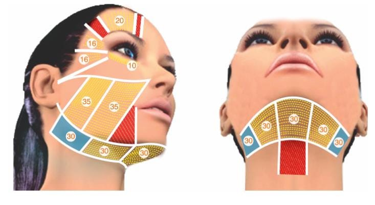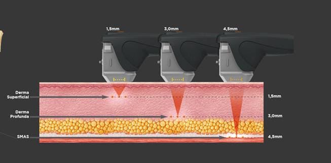 Em um tratamento ideal é necessário atingir uma ampla gama de profundidade, tratando derme, derme reticular e SMAS (9).