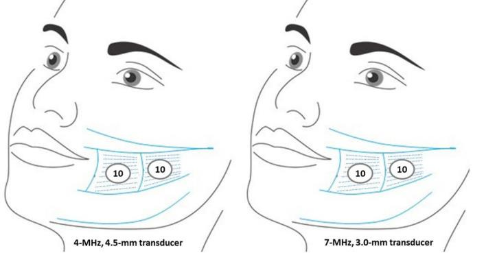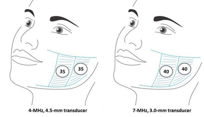 Lee et al. utilizaram transdutores de 4 MHz/4,5 mm e 7 MHz/3,0 mm para entregar uma média de 238 linhas nas camadas dérmicas e fibrosas da face inferior da face e pescoço, resultando em melhorias para 90% dos pacientes em 90 dias após o tratamento (19).