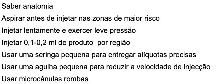 A maioria dos eventos adversos pode ser evitada com a utilização de uma técnica adequada, um bom planejamento e um conhecimento amplo dos materiais a serem utilizados e da anatomia facial.