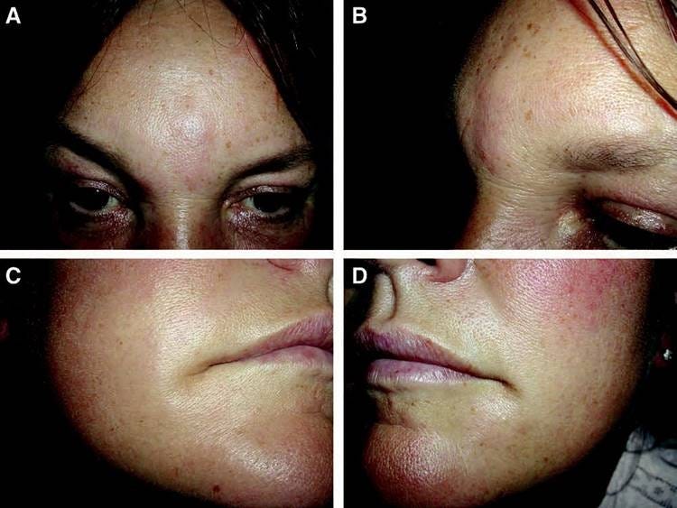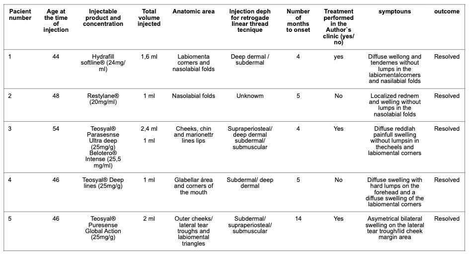 Pérez-Pérez et al. (2017), relataram um caso de complicação por preenchimento com ácido hialurônico. A paciente apresentou “lesões endurecidas, palpáveis e assintomáticas” no sulco melomental (linha de marionete), que surgiram quatro meses após a injeção com Juvederm Voluma® e Juvederm Volift®. A paciente evoluiu com melhora da lesão, porém, com recidivas em outras áreas da face durante até quatro meses depois do primeiro episódio.