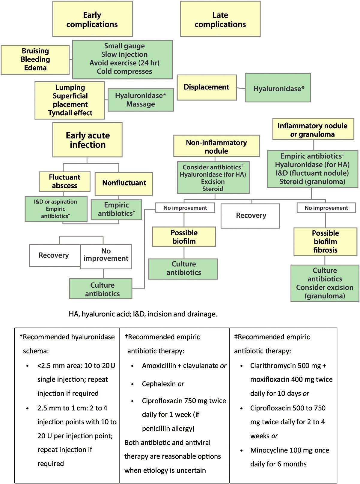Signorini et al. (2016) relatam um tratamento empírico com Claritromicina 500 mg e Moxifloxacina 400 mg duas vezes ao dia por 10 dias ou então Ciprofloxacina 500 ou 750 mg duas vezes ao dia por duas a quatro semanas ou Minociclina 100 mg uma vez ao dia por 6 dias. Aplica-se de 10 a 20U de Hialuronidase em áreas menores que 2,5 cm em injeção única, mas a mesma pode se repetir caso necessário. Em áreas maiores que 2,5 cm, pode-se aplicar de dois a quatro pontos com 10 a 20U em cada. Ou também pode-se fazer injeção intralesional com corticoides.