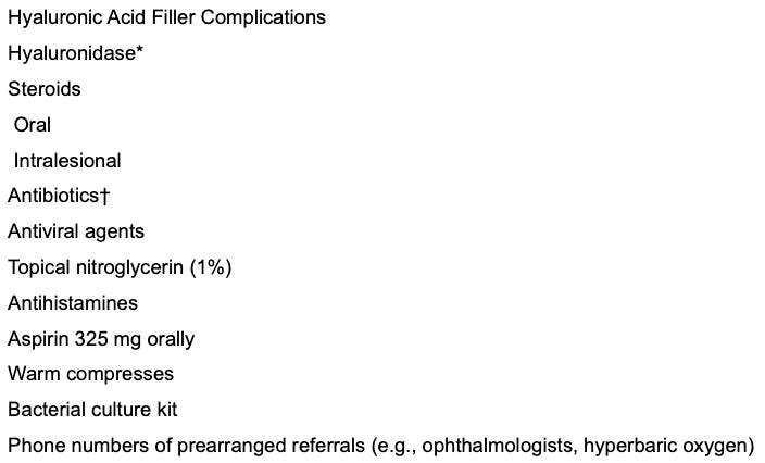 Um pequeno risco de complicações existe em todos os procedimentos de preenchimento facial, mas existem algumas estratégias descritas por Signorini et al., 2016, que podem diminuí-lo, e para isso sugerem a montagem de um “kit ferramenta” (tabela II) para ter sempre no consultório, caso a complicação surja.