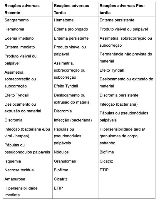 Segundo Monteiro, em 2014, o momento do aparecimento da complicação em relação ao instante da injeção do produto é importante para o raciocínio clínico e para o manejo terapêutico do paciente. Ele classificou essas reações adversas em: recente, tardia e “pós-tardia”, sendo que a recente ocorre até 14 dias após o procedimento, a tardia ocorre entre 14 dias e 1 ano, e a “pós-tardia” após um ano. Signorini et al., 2016, também relataram algumas reações adversas que podem ser recentes e outras que são tardias.