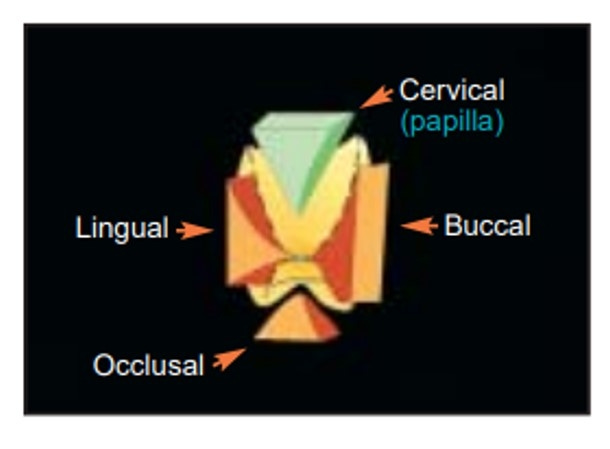 Na região anterior, a papila apresenta formato piramidal e ocupa o espaço localizado entre dois dentes adjacentes, coronalmente à crista óssea alveolar, abaixo do ponto de contato. Na região posterior, a papila é ampla e apresenta uma área côncava não queratinizada, denominada área do “col”, que une a papila vestibular à lingual (Dall’Magro et al., 2016).