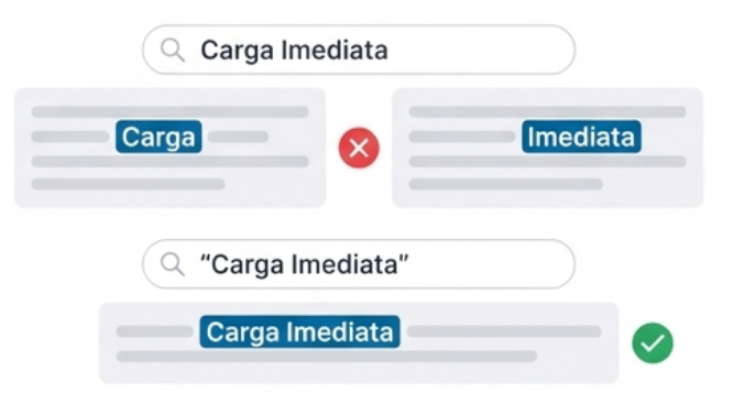 Pra resolver isso, ao usar aspas — “Carga Imediata” — você “cola” as palavras. O buscador só trará resultados onde essas duas palavras aparecem juntas e exatamente nessa ordem.