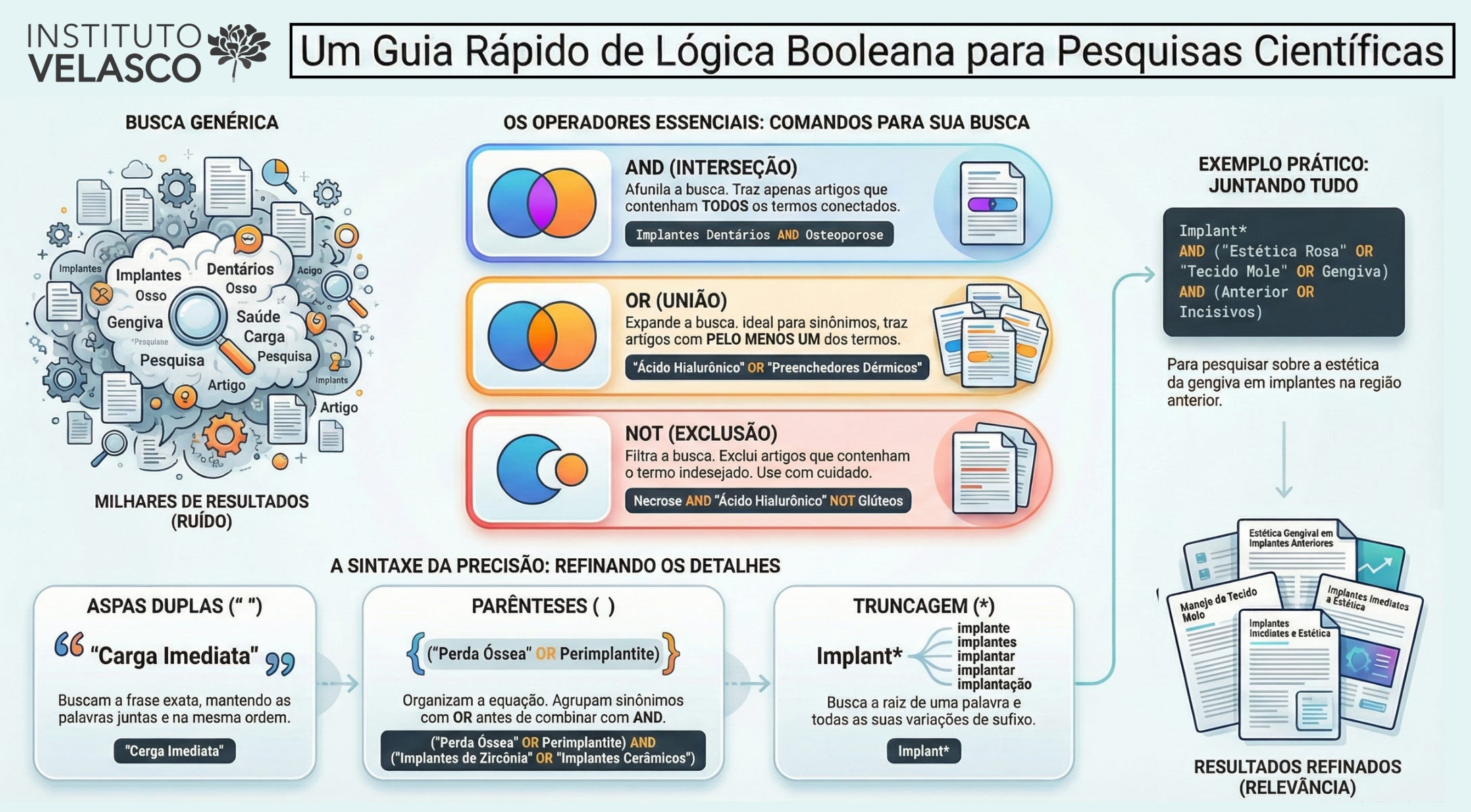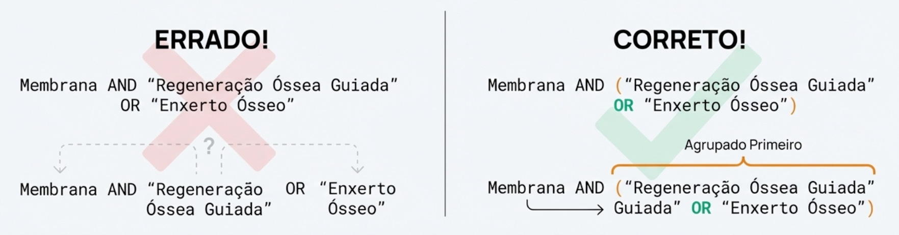 Na ciência, diferentes autores usam diferentes nomes para descrever o mesmo fenômeno, material ou técnica. O operador OR é a ferramenta de expansão. Ele instrui a base de dados a trazer artigos que contenham pelo menos um dos termos listados. É fundamental para agrupar sinônimos.