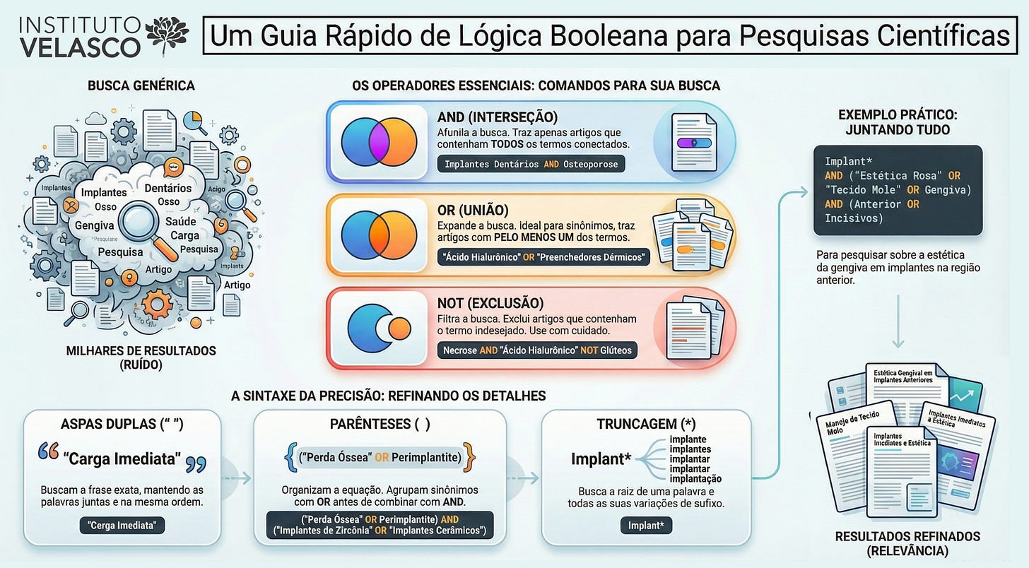 Para exemplificar, vamos construir uma busca complexa em Implantodontia: você quer saber sobre a perda óssea (Conceito A) ao redor de implantes de zircônia (Conceito B).