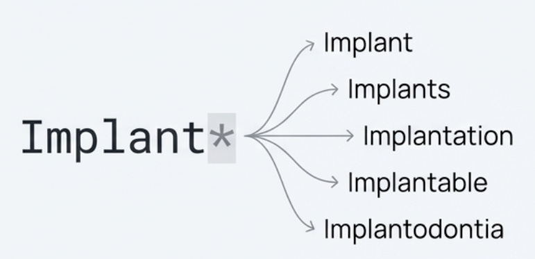 Um exemplo, eu quero tudo que traga o termo ImplantXXXXX. Em vez de digitar todas as variações que você lembra, tipo (Implante OR Implantes OR Implantodontia OR Implantar) etc, Você digita apenas: Implant*, com asterisco no final