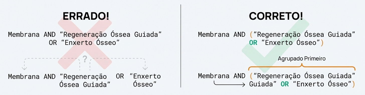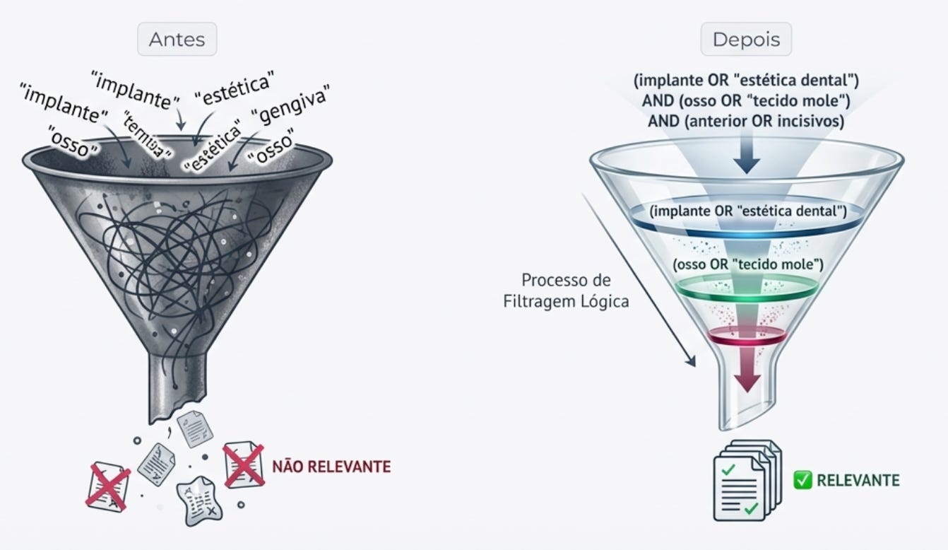 Os parênteses garantem que o sistema primeiro reúna todas as variações de “perda óssea”, depois reúna todas as variações de “zircônia”, e só no final faça a interseção (AND) entre os dois grupos.